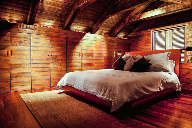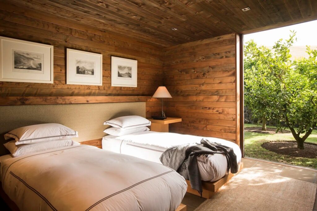 The mezzanine king master bedroom is warmed by all-day sun, and a view across rolling pasture. Internal shutters that open to the double-height living space and look through to a view of the bay. Downstairs, a timber-lined twin room opening to the garden offers generous family accommodation.