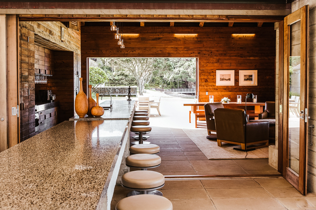 Huge, barn-style doors slide back to open the relaxed central living space with its soaring cathedral ceiling up to all-day sun and sea air off the calm waters of Wairoa Bay.
