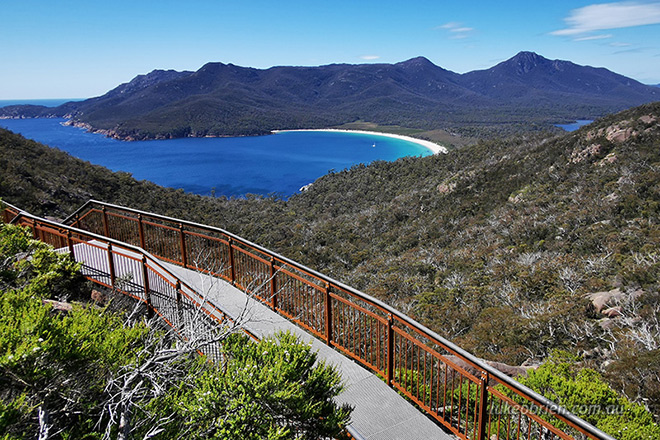 As you begin your hike you’ll be captivated by the breath-taking views of Wineglass Bay and its surrounding granite mountains. Wineglass Bay’s sensual shape and breathtakingly blue water have a white sandy beach exclamation point. To actually see the wineglass shape of the bay, you’ll have to hike to get to this elevated lookout. Despite the ascent, this trail is suitable for just about everyone.